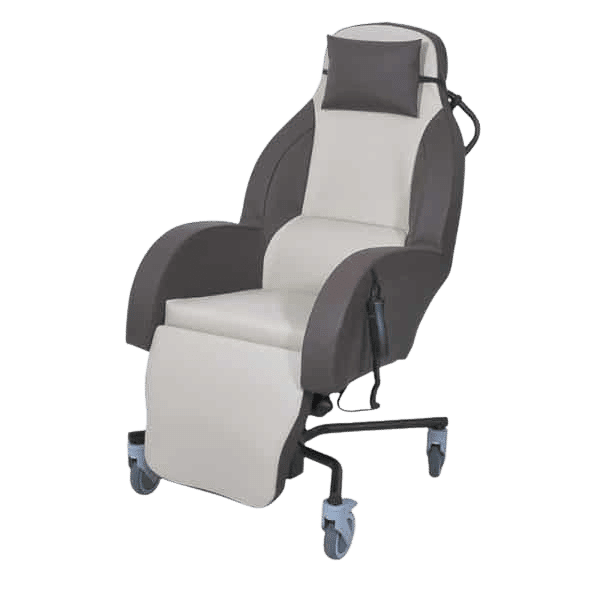 כורסא גריאטרית עם מנגנון הטייה טילט ומשענת ראש תוצרת צרפת; מתאימה בעיקר לבתי אבות או מוסדות גריאטריים.