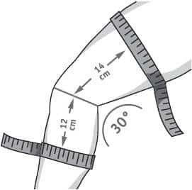 נא להקיף עם סרט מדידה: כ- 12 ס"מ מתחת לפיקת הברך וכ- 14 ס"מ מעל קו הברך כפי שמופיע בתמונה.